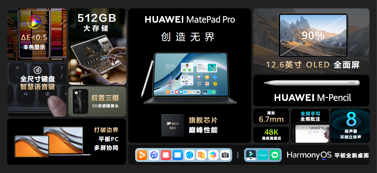 该机搭载 5nm 麒麟 9000 系列芯片;它拥有 12.6 英寸 OLED 全面屏,支持第二代 HUAWEI M-Pencil 手写笔,可与华为手机、电脑和智慧屏之间进行协同。此外,华为 MatePad Pro 在界面设计、交互控制、通知服务、分布式体验等领域均进行了大幅升级。