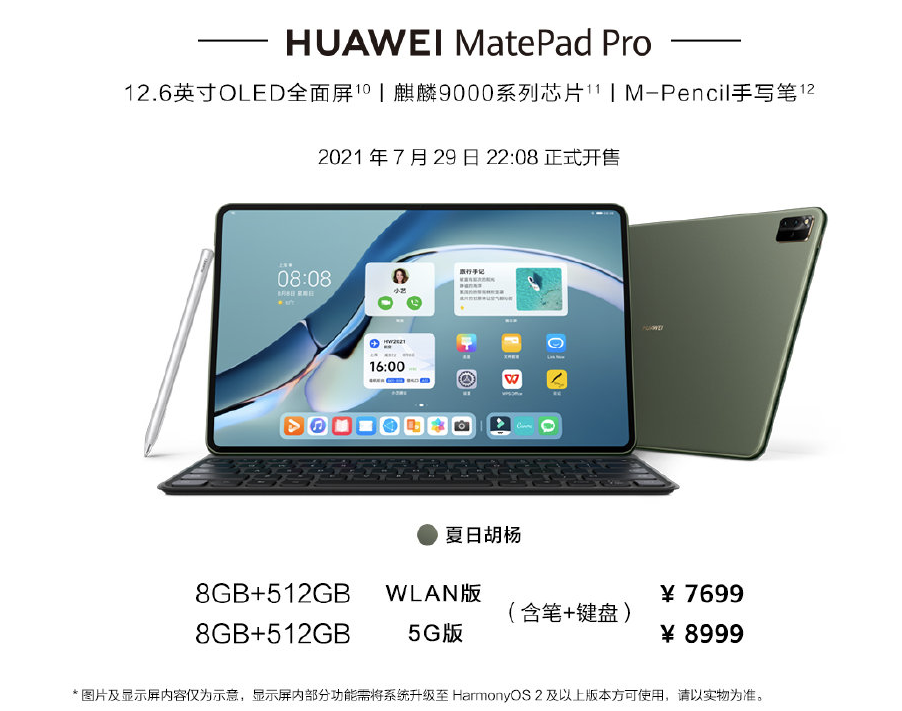 29日晚,华为除了推出 P50 系列手机外。还推出了一款 MatePad Pro 12.6 英寸的 512G 版本,售价 7699 元(WLAN),5G 版本则为 8999 元,均提供第二代 HUAWEI M-Pencil 和专属智能磁吸键盘,将在 7 月 29 日 22:08 开售。