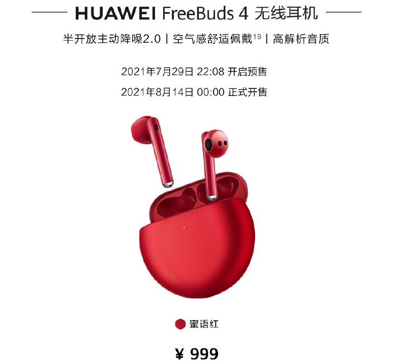 999 元,华为推出 FreeBuds 4 耳机密语红版本