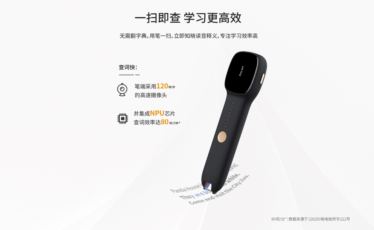 传统学习场景中,孩子查字词,主要依靠纸质词典或者手机软件。翻字典,效率太低;翻手机,诱惑太多。针对传统学习中的查询问题,阿尔法蛋智能词典笔S逐一解决,它可以一扫即查,快速高效聚焦学习。之所以如此“闪电速度”,是因为它搭载了一颗算力高达400GOPS的深度神经网络硬件加速单元(NPU)芯片和每秒扫描120帧图像的高速摄像头。