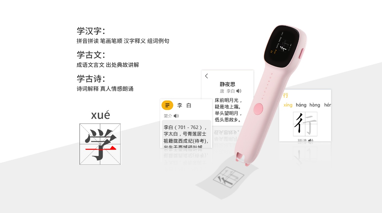 阿尔法蛋智能词典笔S在汉字启蒙方面拥有非常细致化的设计,孩子可以扫拼音,学拼音书写和发音,扫汉字还能查看标准的汉字笔顺动画,养成正确书写汉字习惯。