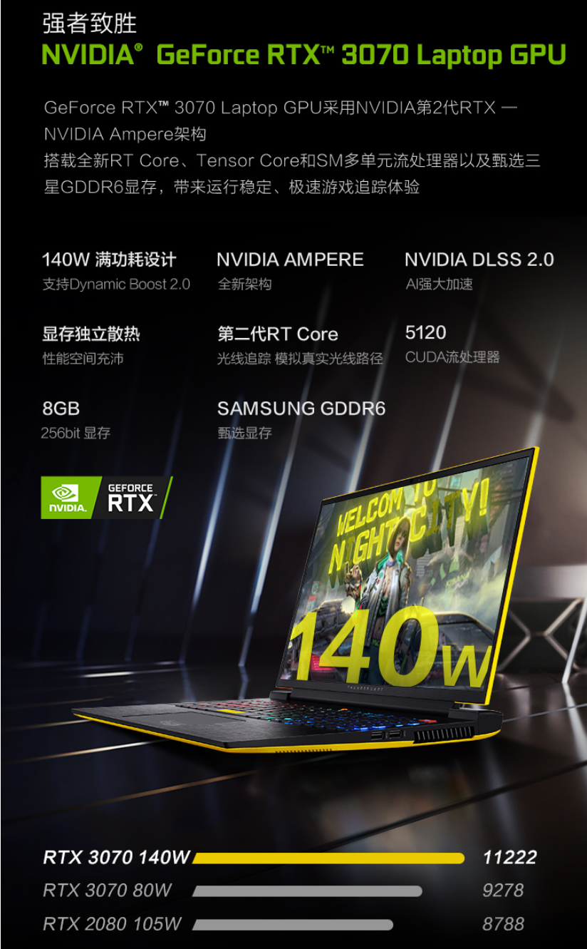 性能方面,笔记本搭载英特尔 11 代酷睿 i9-11900H 处理器,拥有 8 核 16 线程,主频可达 4.9GHz。显卡采用的则是移动版 RTX 3070,具备 5120 个 CUDA 核心、8GB GDDR6 显存,性能释放达 140W。