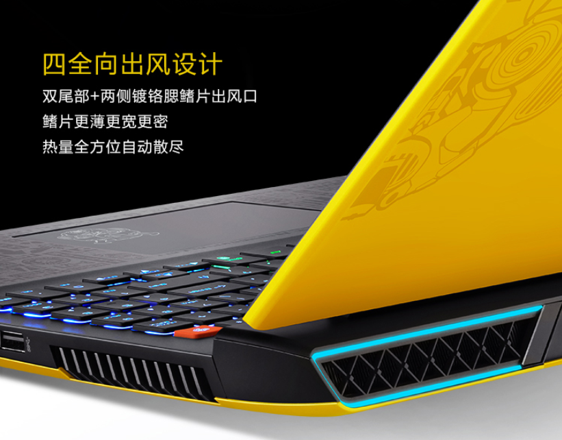 IT之家了解到,雷神 ZERO 大黄蜂联名版采用风洞 Pro 散热架构 2.0,拥有 12V LCP 液晶了涡轮风扇、四出风口。笔记本还配备 1680 万色 RGB 键盘、雷电 4 接口。笔记本的 C 面具有大面积变形金刚主题水印,同时空格键也印有大黄蜂英文名称,彰显特殊的联名身份。