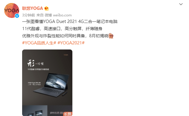 8 月 1 日消息 联想 YOGA 官方微博在今日再次为即将发布的联想 YOGA Duet 2021 4G 二合一笔记本做预热,官方给出了该笔记本的“一图知”,并表示该笔记本将于今年 8 月初发布。
