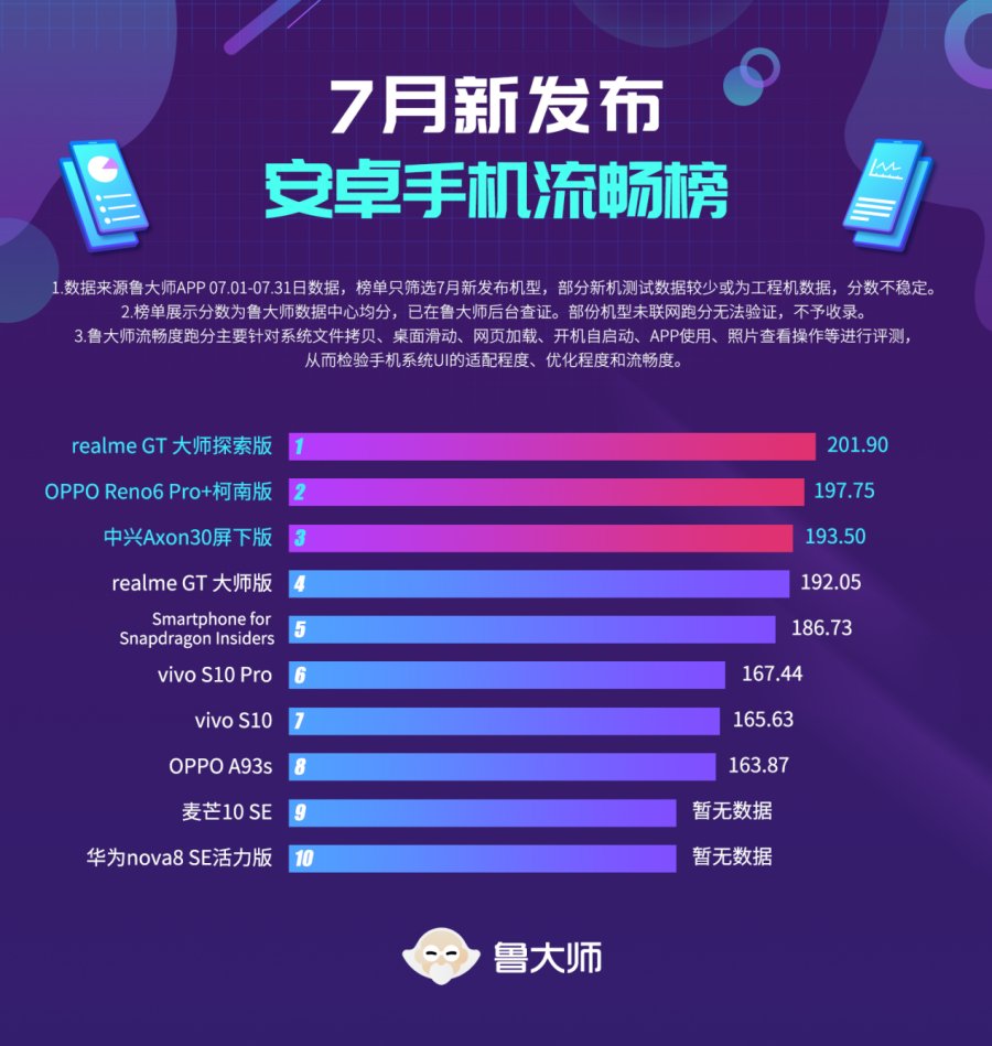 鲁大师7月新机流畅榜:realme GT大师探索版拿下冠军!