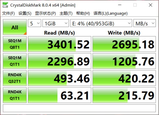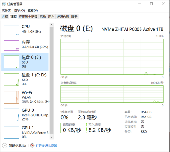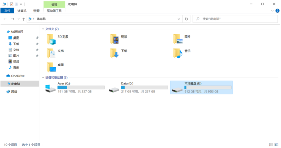 成功将PC005 Active安装到笔记本之后,打开系统就可以看到致钛PC005 Active作为从盘被系统所识别,容量为953GB,这是由于电脑的二进制识别的原因。一般来说硬盘厂商以1000为进制进行容量标定,而系统则是以1024为进制,以GB进行计算的话,就是1000x1000x1000/1024/1024GB,结果显示就是954GB。