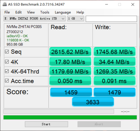 我们也对致钛PC005 Active使用AS SSD BenchMark以及CrystalDiskMark进行性能的测试。在CrystalDiskMark的测试中,致钛PC005 Active的顺序读取为3401MB/s,而写入速度为3695MB/s,此外AS SSD Benchmark的跑分也达到了3633分,远超笔记本自带的NVMe SSD,达到了高性能SSD的水平,存储3A游戏大作也是丝毫没有任何的问题,还能加快游戏加载速度与文件拷贝速度,进而带来更加出色的使用体验。