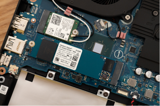 然后我们打开笔记本的后盖,可以看到这一款笔记本采用的是双M.2插槽,也就是说可以安装两根NVMe SSD,大大方便玩家扩展笔记本的容量,不过有些笔记本只预留了一个M.2插槽,那么玩家在更换SSD的时候,就需要先将原来的NVMe SSD卸载,随后安装致钛PC005 Active。然而有些笔记本厂商在配装笔记本的时候,有时会将系统的固件参数写入到原有的硬盘之中,如果直接进行替换,会有进不去系统的情况,大家在替换的时候需要注意。