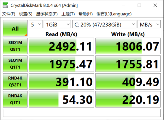 我们使用CrystalDiskMark以及AS SSD Benchmark对初始硬盘进行测试,结果发现这款硬盘是典型的半盘,读取速度为2492MB/s,写入速度则是1806MB/s,这个速度就属于主流级的水平,称不上高性能。而用AS SSD BenchMark进行测试,我们发现这款硬盘的跑分为2228分,这款硬盘大约是SATA SSD 2倍左右的性能,属于NVMe SSD中的主流水平。