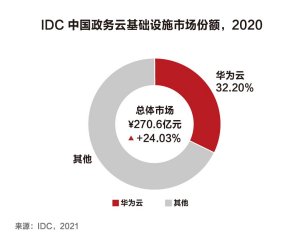 8月5日,全球知名分析机构IDC发布了《中国政务云基础设施市场份额,2020:泾渭分明》的报告(后文简称“报告”)。报告显示,中国政务云基础设施市场的总规模达到了270.6亿元,增长高达24.03%。其中华为云在政务云市场占有率32.2%,连续4年蝉联中国政务云基础设施市场份额第一。得益于中国政府数字化进程的加速以及在技术实力上的领先,华为云备受政企客户青睐,相比去年同期,华为云在占领接近3成政务云市场份额的同时依旧保持了约20.3%的快速增长。