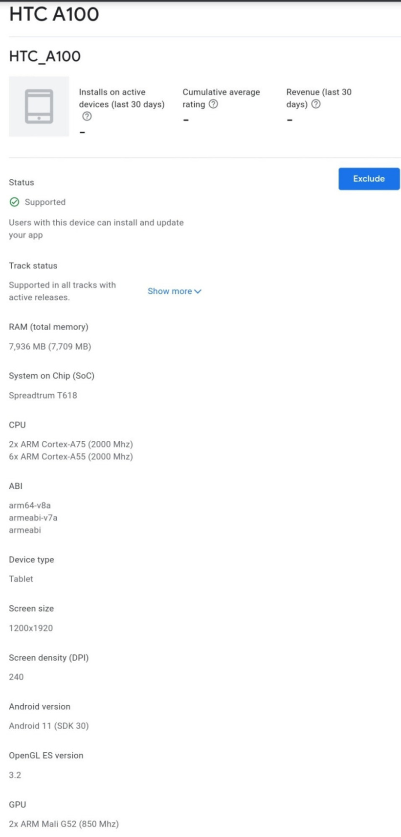 8 月 4 日消息 HTC 一款新平板近日现身 Google Play Console,代号 HTC A100,搭载紫光展锐虎贲 T618 处理器,8GB 内存,屏幕分辨率为 1920x 1200,运行 Android 11 系统。