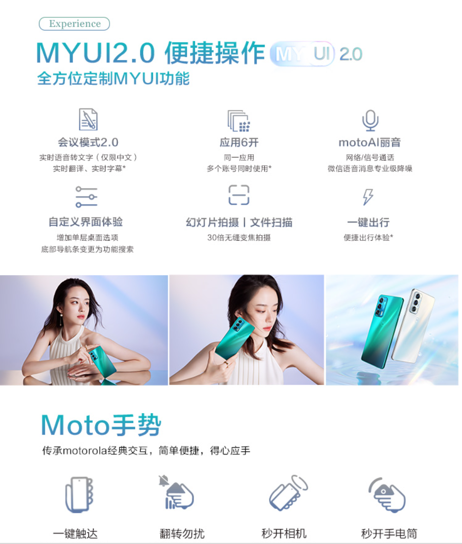 此外,摩托罗拉 edge 轻奢版配备 4020mAh 电池,支持 33W 充电与侧边指纹识别,同样搭载 MYUI2.0 系统,拥有应用 6 开、一键出行等多项功能。