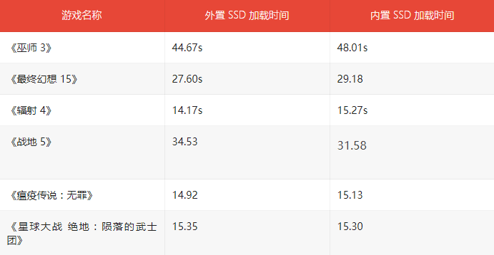 要想测试外置 SSD 的性能,最好的办法是测试游戏加载时间。外媒的测试结果表明,大多数情况下,三星 980 Pro 的加载时间均快于内置存储,最高要快将近 4 秒。以下为详细测试数据: