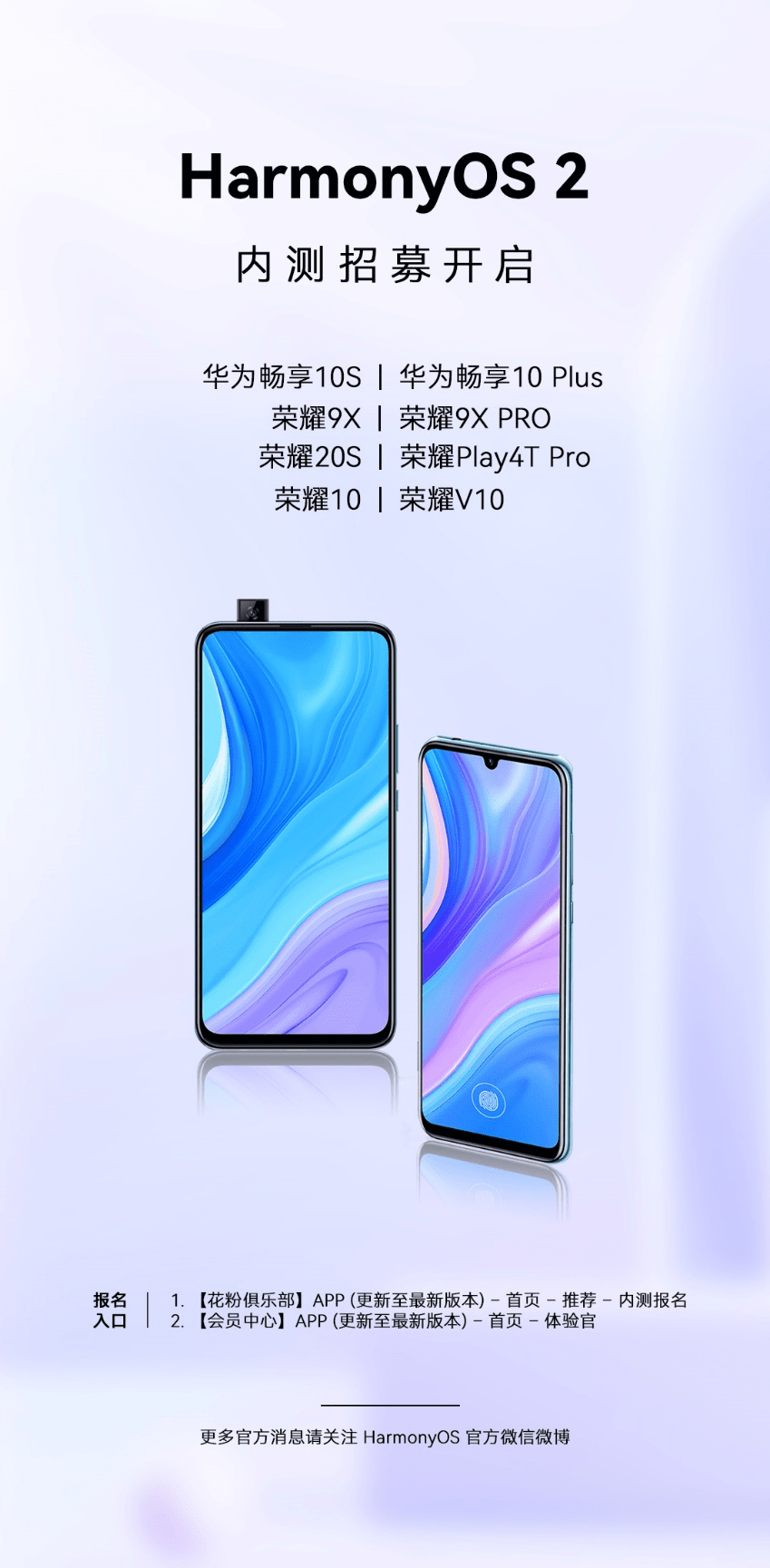 如果你手持畅享10S、畅享10 Plus、荣耀9X系列、荣耀20S等机型,赶紧打开【花粉俱乐部】APP-首页-推荐- 内测报名,或【会员中心】APP-首页-体验官,提交内测申请,名额有限、先到先得!更多升级资讯,可以持续关注【我的华为】APP、花粉俱乐部、HarmonyOS官方微博和微信公众号。