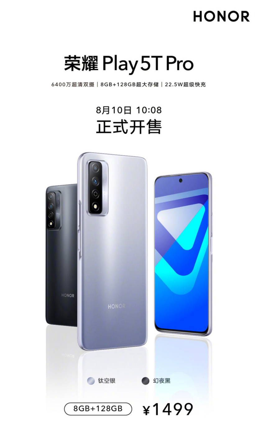 8 月 10 日消息 荣耀 Play5T Pro 今日开启首销,8+128GB 版本 1499 元,提供钛空银和幻夜黑两种配色。