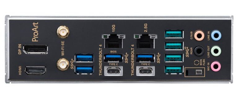 该主板采用低调的纯黑色设计风格,面向 3D、CAD 设计师和专业用户打造,主板配备双雷电 4 接口,四个 USB 3.2 Gen2 口以及四个 USB 3.2 Gen1 接口。为了满足专业用户连接存储服务器的需求,主板配备了一个 10Gbps 有线网口,最大传输速度可达 1.2GB/s,此外还有一个 2.5G 网口。