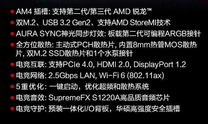 华硕此款主板支持动态超频技术,便于 AMD 锐龙处理器超频。此外,主板具有 OptiMem II 内存超频技术,可以使 DDR4 内存的频率提升至最高 5100MHz。此外,主板还有专门的水冷散热器供电口。接口方面,主板具有 PCIe 4.0 M.2 固态硬盘插槽,最高支持 110mm 长度的企业级 SSD。这款主板配备两个有线网口,一个为千兆规格,另一个为 2.5Gbps 网口。主板还具有大量 USB 3.2 Gen 2 A 型接口、Type-C 接口,同时内置 ROG SupremeFX S1220A 声卡,提供 120dB 信噪比。