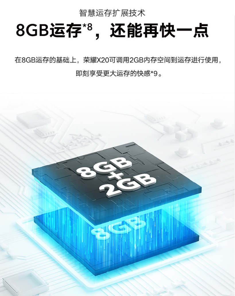 荣耀 X20 内置 4300mAh 电池,支持 66W 超级快充,随包装附送快充充电器。这款手机还支持智慧运存扩展技术,在原有 8GB 内存的基础上增加 2GB 内存。
