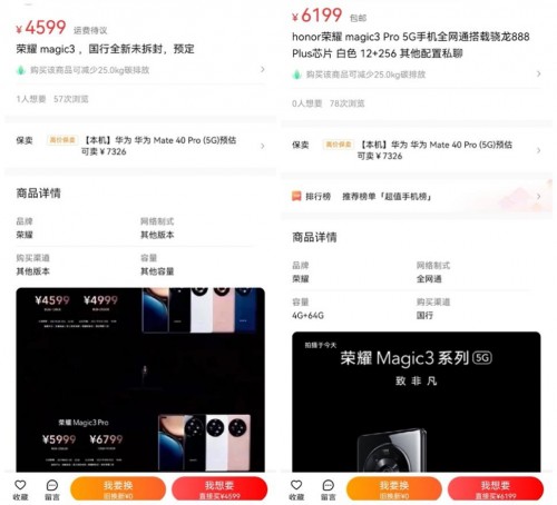 与此同时,在发布会结束不久,转转平台的自由市场上就同步出现了荣耀Magic3的预售信息。根据转转手机行情显示,荣耀Magic3基础版多为平价预售,而Pro版则是加价状态,加价幅度在200元左右。