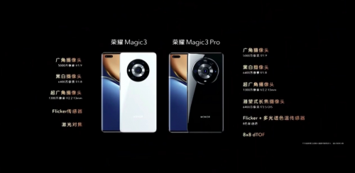 影像功能是本次荣耀Magic3系列的一大亮点。其中,荣耀Magic3后置相机模组由5000万主摄+6400万黑白镜头+1300万广角微距镜头+激光对焦系统组成;荣耀Magic3 Pro则由5000万主摄+6400万黑白镜头+1300万广角微距镜头+6400万长焦镜头+8×8 dToF激光对焦系统组成。