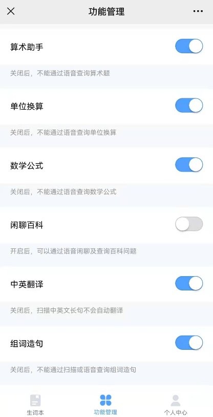 在设置上,T10可以进行发音设置、调整词典顺序、握笔方向,更方便孩子使用。但还有一点,小编觉得与众不同,且非常人性化,即T10具有的家长管理功能,家长可以讲词典笔绑定公众号和APP,其中有功能管理模块“算术助手”、“单位换算”、“数学公式”、“闲聊百科”、“中英翻译”、“组词造句”、“近反义词”,如果在写作业等的场景下,家长担心孩子不专心,拿词典笔语音闲聊或者太依赖翻译,不自己翻译,就可以关闭这项功能。等到孩子进行课外阅读的时候,需要这些功能再打开。这样既能让词典笔帮助孩子去提高学习效率,但也不会担心孩子对词典笔产生依赖性。