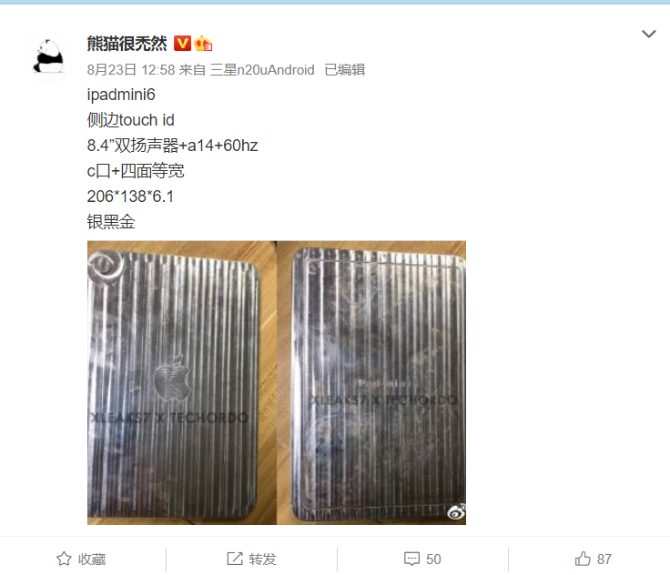 据微博博主 @熊猫很禿然 爆料,iPad mini 6 采用了侧边 Touch ID 指纹识别,搭载了 8.4 英寸屏幕,双扬声器 + A14+60Hz 四面等宽屏幕,采用 USB-C 接口,尺寸为 206mm X 138mm X 6.1mm,拥有银黑金配色。