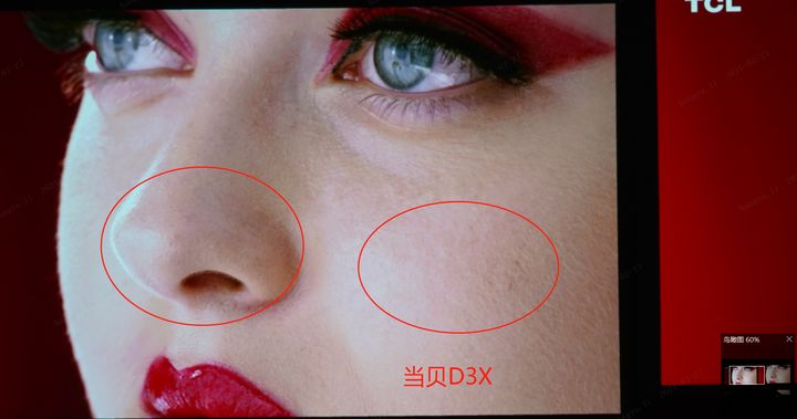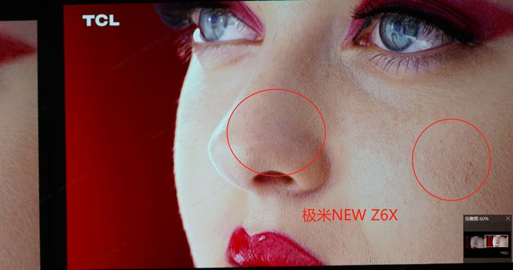 两款产品都使用了0.33DMD芯片,但照片放大60%之后,极米的画面会细腻许多,在大屏观看的时候,差距明显。而且一看就知道,这不是虚焦的差距,而是画面还原的问题。