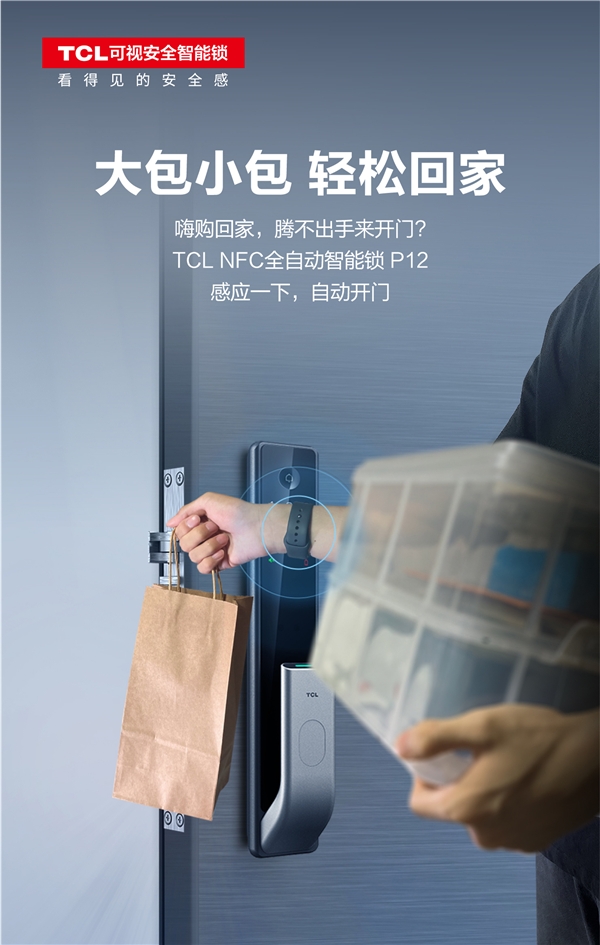 此次发布的新品P12 是TCL首次研发手机NFC开锁方式的全自动智能锁,支持多品牌安卓系统的手机和市面大部分手环使用,只需感应一下,即可开锁,给手机不离手的人们、指纹有磨损的老人带来更便捷的开门方式。P12还带有TCL智能锁体,具备关门自动上锁,未关门提醒,解救强迫症和健忘症,不为反复确认门关了没、上锁了没等情况而苦恼。
