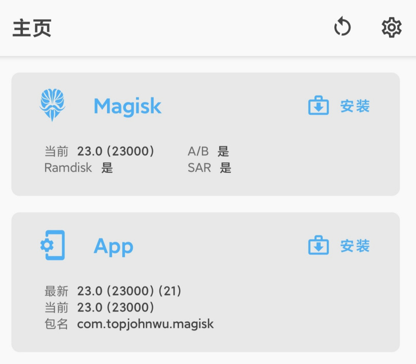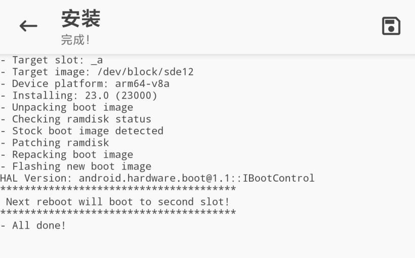 如果出现以上文字,即证明成功为新的 boot 分区刷入 Magisk,放心大胆重启即可。再次开机后,可以打开 Magisk App,检查是否成功。