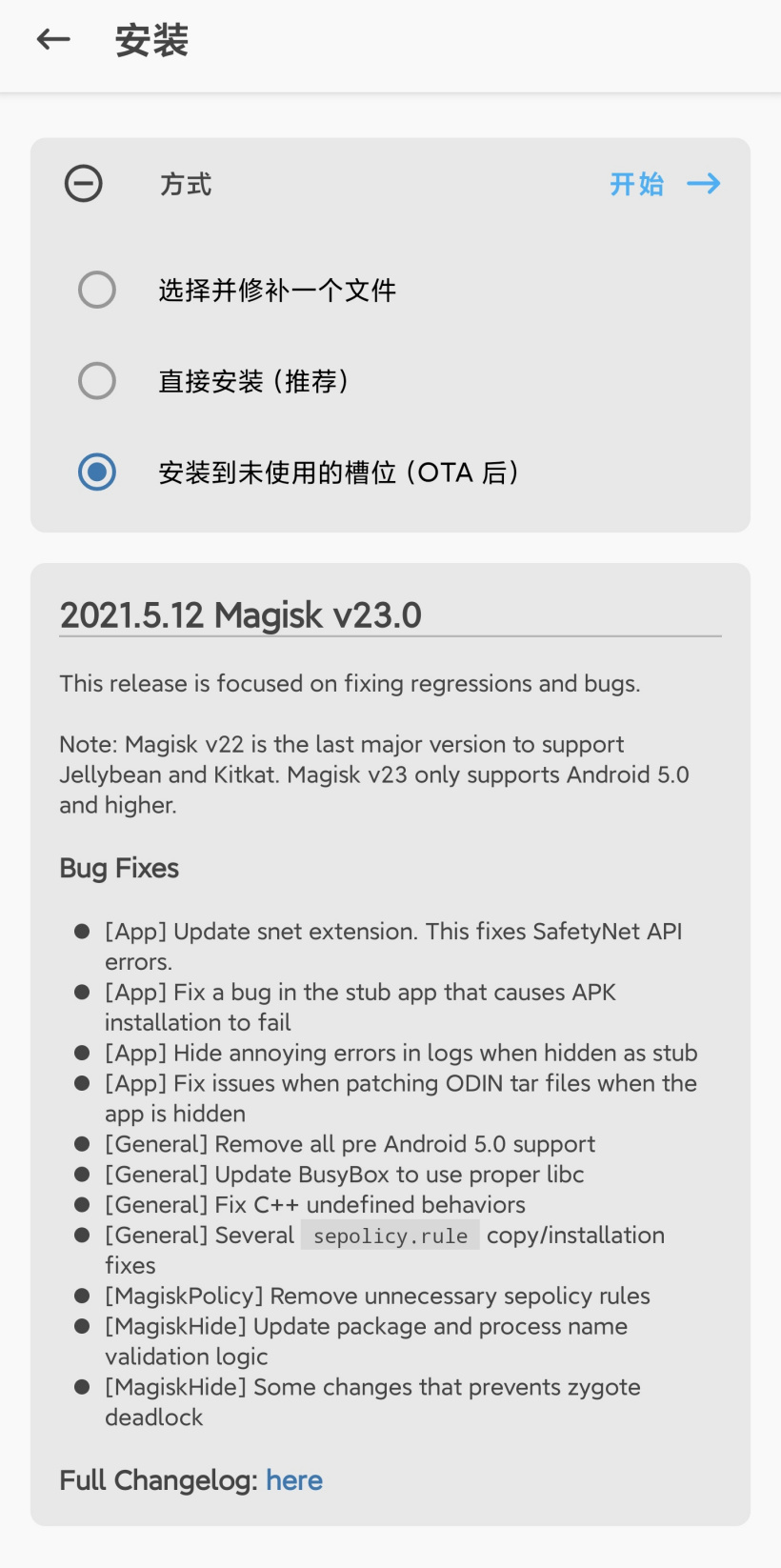本次需要使用第三种方式安装,因为小米 11 使用 V-AB 分区方式,有两个 boot 分区,每次更新系统时交替使用。OTA 升级后,再次重启会切换至另一个分区。在这里,需要选择“安装到未使用的槽位”,并点击蓝色的字“开始”。