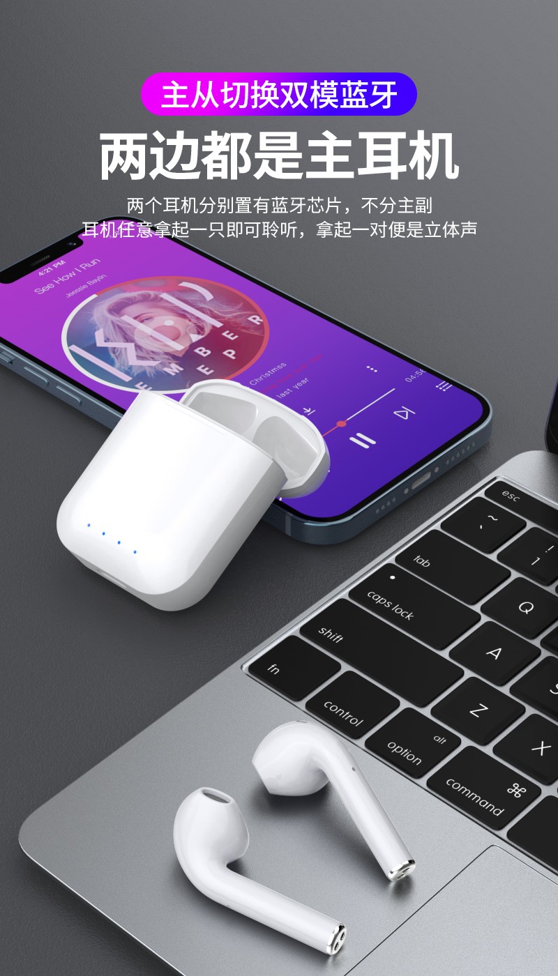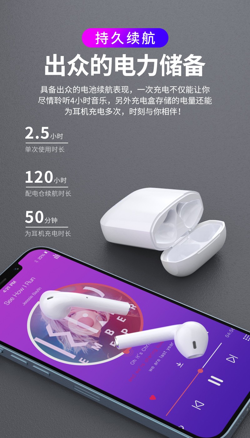 l 持久续航不能少,一次快充,4小时听音+120小时充电盒电量储存;