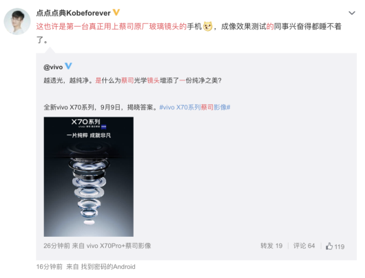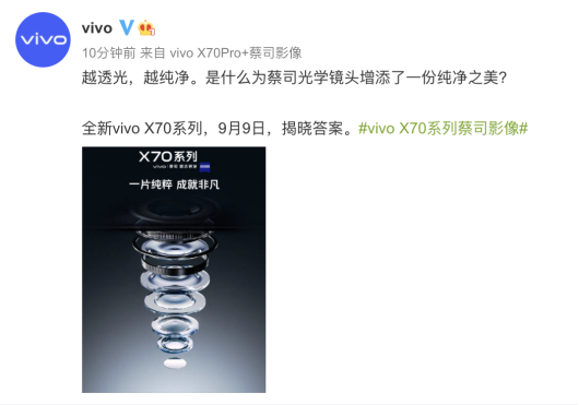 就在海报发布后不久,vivo产品经理赵典(@点点点典Kobeforever)发文爆料称vivo X70系列将采用蔡司原厂玻璃镜片,材质工艺将达到目前手机镜头的新高度,带来更高的进光量、更低的色散。同时,vivo官方发布了一条投票微博,发问“探索影像新视界,关于「镜头」你怎么看?”,强化镜头之于影像系统的重要性。可见,vivo X70系列或将采用高规格玻璃镜片,提升进光量,在光学器件领域更进一步。