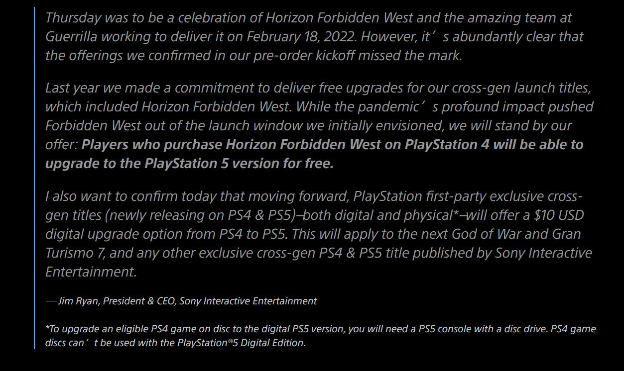 近日,索尼官方在博客上紧急更新,索尼互动娱乐 CEO Jim Ryan 发文,尽管疫情的影响让他们对升级 PS4 版《地平线:西之绝境》产生了错误的判断,但在听取玩家的意见之后,该作将支持 PS4 版免费升级到 PS5 版。