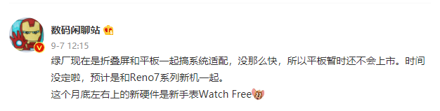 该博主还透露,OPPO 目前正在为折叠屏手机和平板一起做系统适配工作,速度并不是很快,所以新的 OPPO 平板短时间内暂时不会上市,预计将和 OPPO Reno 7 系列新机一起推出。