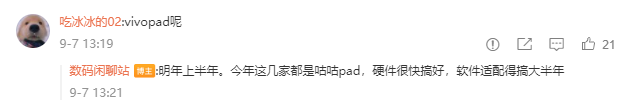 此外,该博主还在评论区表示,vivo Pad 可能将于明年上半年发布。该博主称,平板的硬件相对比较容易做好,不过软件适配需要大半年的时间。