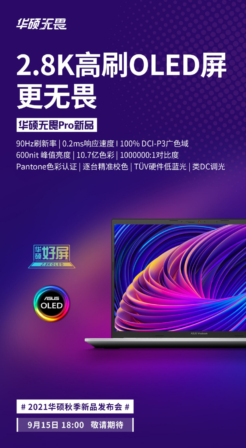 根据此前华硕官方预热消息,新款华硕无畏 Pro 笔记本将配备 2.8K OLED 屏幕,支持 90Hz 刷新率,采用 16:10 黄金比例,覆盖 100% DCI-P3 广色域,具有 600nit 峰值亮度、10.7 亿色以及 1000000:1 的对比度。