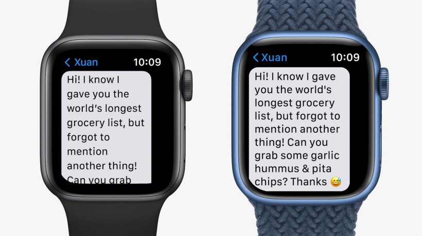 Apple Watch Series 7 显示屏周围的边框更细,只有 1.7 毫米,always-on 屏幕模式的亮度提高了 70%。苹果公司称,与 Apple Watch Series 6 相比,你可以在显示屏上多塞进 50% 的文字,新的显示屏也意味着新的互动方式,全键盘将支持滑动。