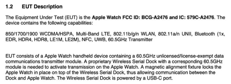 文件表明,只有被放置在一个带有相应 60.5GHz 模块的专用磁吸底座上时, Apple Watch Series 7 的 60.5GHz 模块才会被激活,但该底座可能会被苹果员工保留使用。比如,用于 Apple Store 的 dock 来无线恢复 Apple Watch。