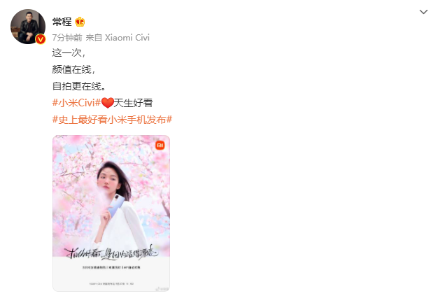 9 月 24 日消息 今日,小米集团副总裁常程在微博预热小米 Civi 新机,“拍的更好看,是因为活的漂亮”,小米 Civi 将配备 3200 万高清相机、双柔光灯,支持 AF 自动对焦。