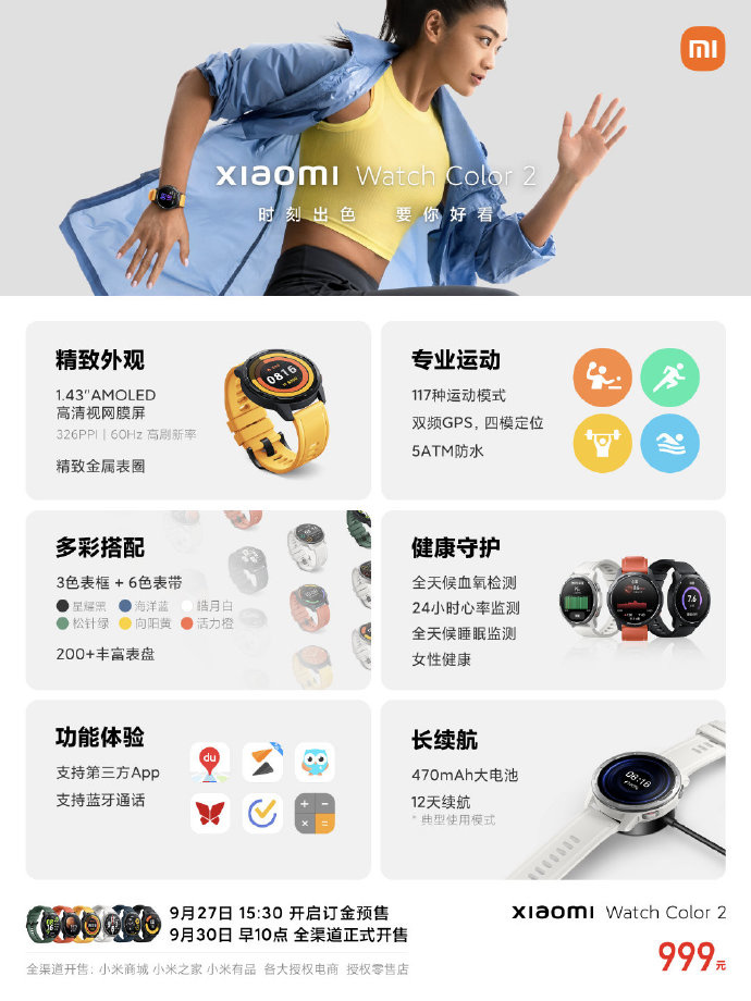 售价方面,小米 Watch Color 2 售价 999 元,将于 9 月 27 日 15:30 开启订金预售,预售价 899 元,9 月 30 日早 10 点全渠道开售。