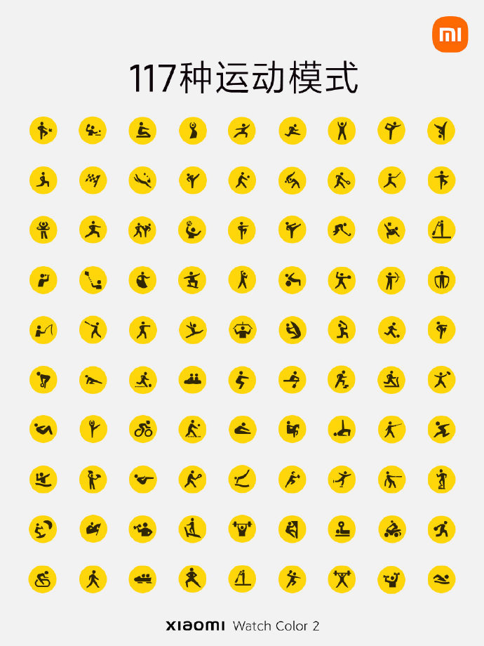 运动方面,小米 Watch Color 2 支持 117 种运动模式、19 种专业运动模式。支持双频 GPS、四模定位、5ATM 防水。