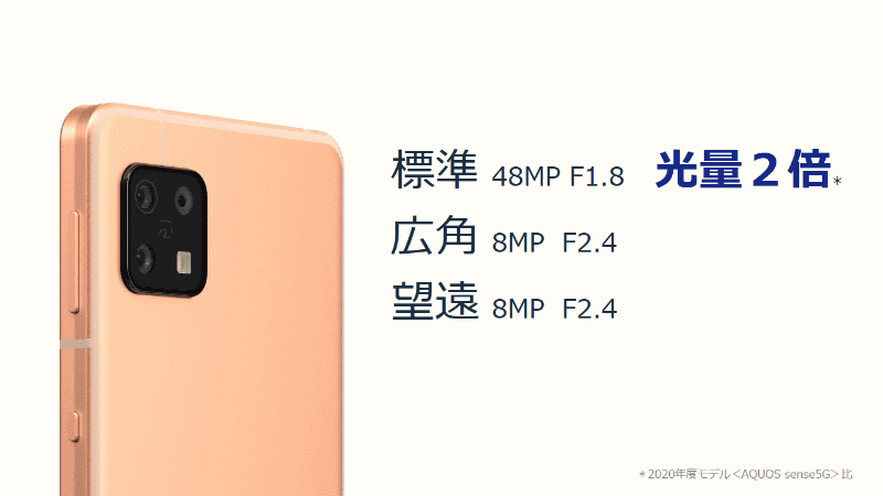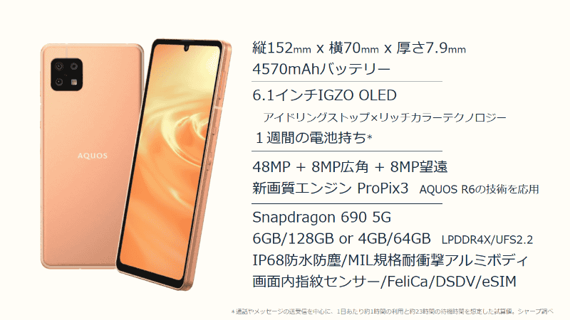 同时亮相的还有的 AQUOS sense6 5G 手机,采用 6.1 英寸 IGZO OLED 显示屏,配备 4570mAh 电池,比之前的 AQUOS sense5G 机型薄了 11%,厚度为 7.9mm,处理器是骁龙 690 5G。