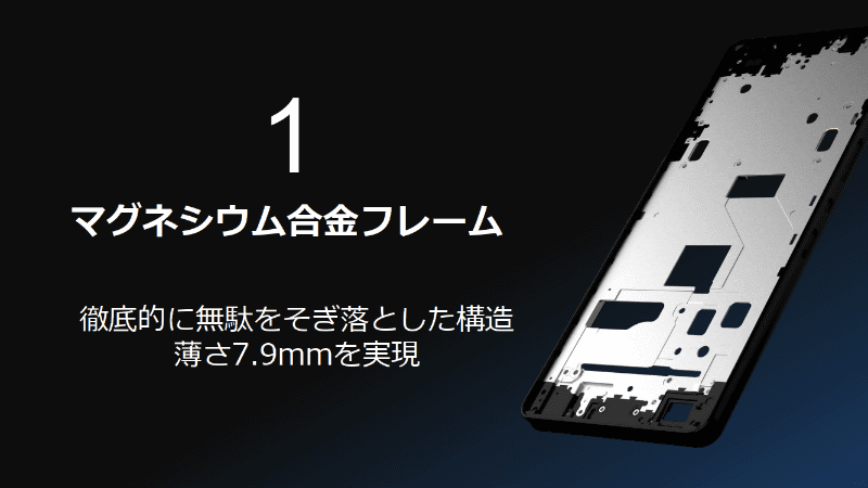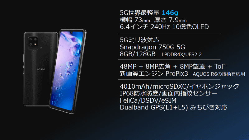 AQUOS zero6 再次回归轻薄设计,采用了骁龙 750G 5G CPU,6.4 英寸 OLED 面板,支持 240Hz 的刷新率,并支持毫米波 5G。其最大亮点是世界上最轻的 5G 手机,重量仅为 146 克,厚度为 7.9 毫米。