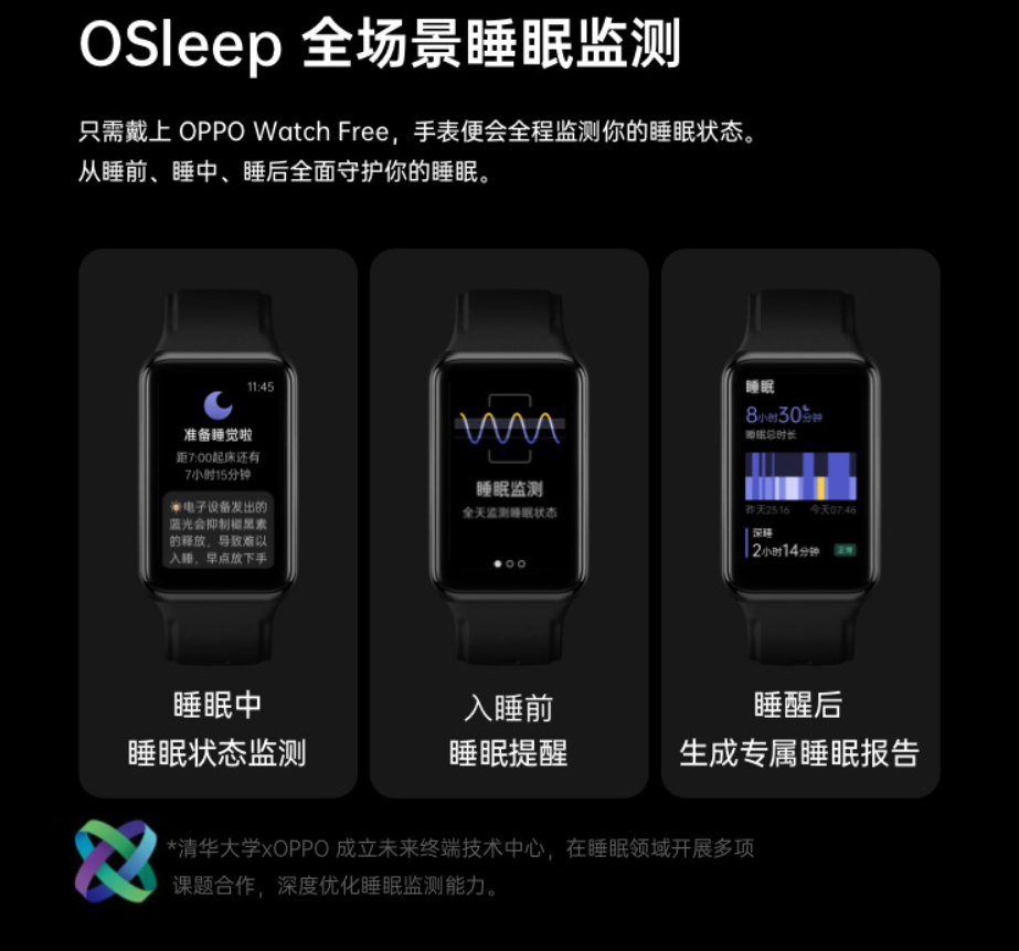 OPPO Watch Free 重点打造了 OSleep 全场景睡眠监测。通过对用户睡前、睡中、睡醒后三大场景进行监测,更科学地帮助年轻人改善多种睡眠问题。