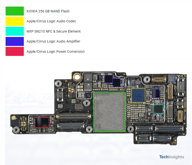 主板背面中央最大的是 KIOXIA 铠侠制造的 256GB NAND 闪存芯片,同时依旧使用了 Cirrus Logic 定制的音频解码器、音频放大器等。此外,还有恩智浦提供的 NFC 控制芯片。