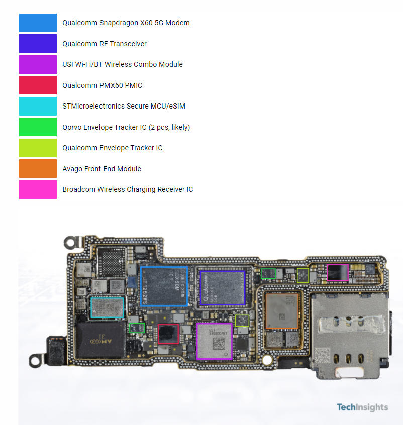 另一层主板上主要为通信相关的芯片,包括高通骁龙 X60 5G 基带、高通射频芯片、电源管理芯片等。此外,苹果 还使用了 Broadcom 博通制造的无线充电 IC。