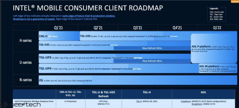 曝光的路线图还显示,英特尔 Alder Lake-P CPU 将在 2021 年 11 月至 2022 年 3 月之间投产,而 Alder Lake-M CPU 将在 2022 年 1 月- 4 月投产。