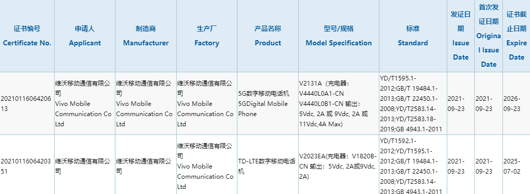 查询发现,该机型号为 V2131A,已获得国家 3C 认证,标配 44W 充电器。