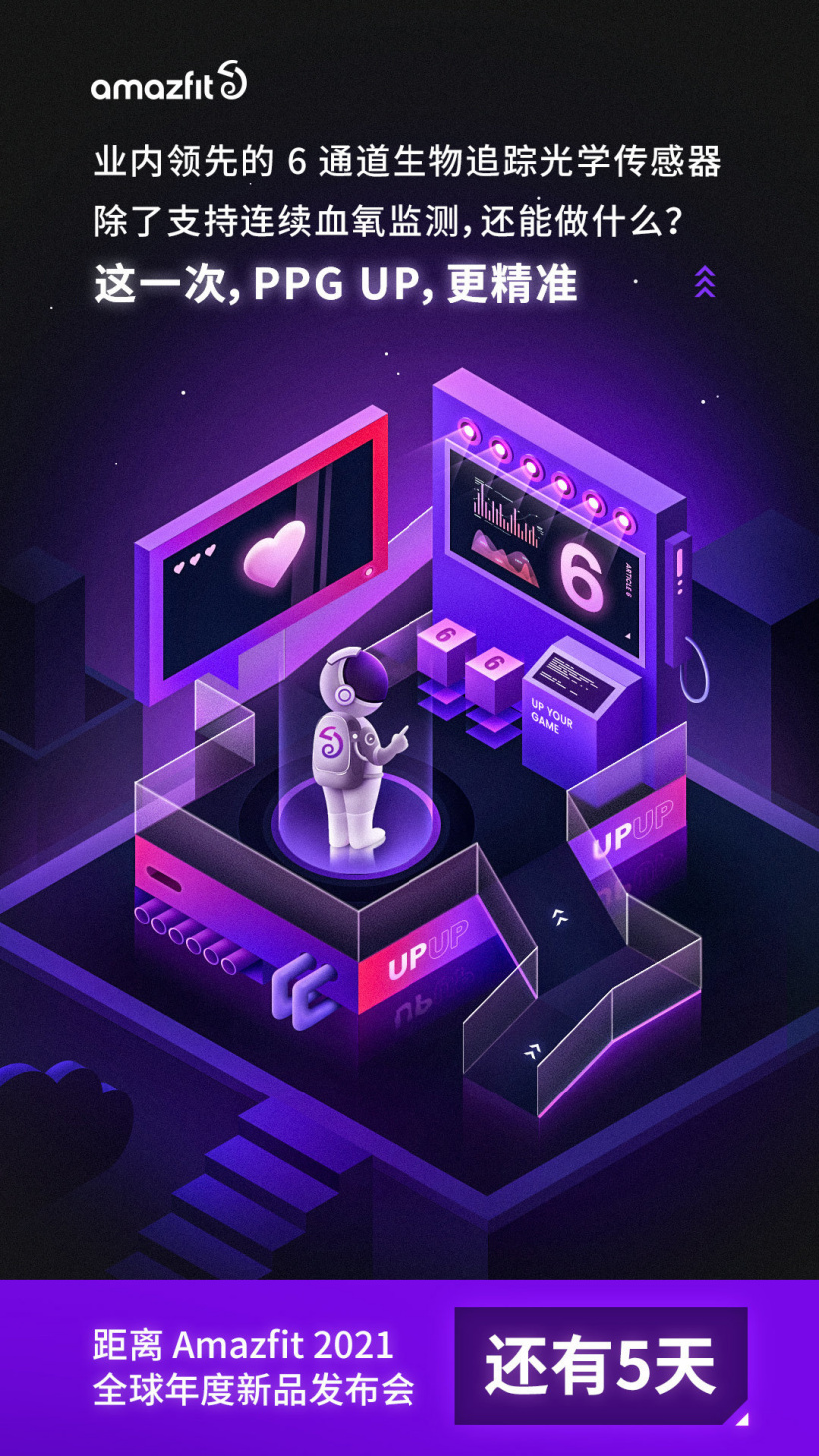 10 月 7 日消息 华米科技将于 10 月 12 日举办 Amazfit 2021 全球年度新品发布会。正式发布 Amazfit GTR 3/Pro 智能手表。今日官方发布海报进行预热,表示新品将搭载 6 通道生物追踪光学传感器。这一高精度传感器将支持连续血氧监测,此外还会提供神秘新功能。