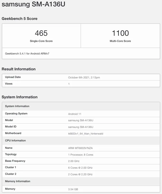 跑分数据显示,Galaxy A13 5G 单核跑分为 465,多核跑分为 1100。